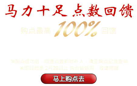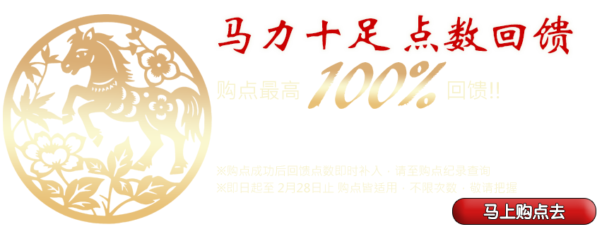 2026贺岁!即日起至 2月28日止,凡于本站单笔购买 人民币300 或 台币1300以上,系统将发送 实际购得点数10%~100% 的回馈点数给您,不限购点次数!买越多送越多!